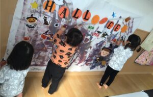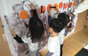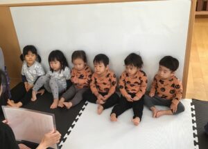 最初にみんなでハロウィンのお話の紙芝居をみて、収穫のお祭りのこと、オバケが出ることなどを知りました。