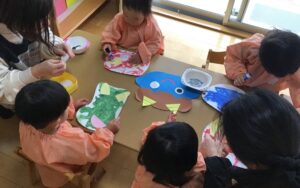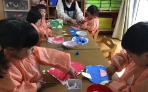 朝の会では『鬼は外~福は内~♪』と元気に歌ったり、制作では鬼のお面や豆入れを作り、節分への期待やイメージを膨らませる子どもたち。