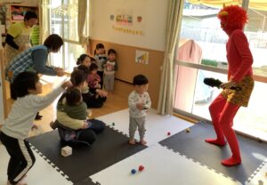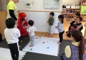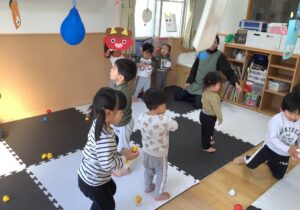 行事についてのお話や紙芝居を聞き『ふーん…鬼さんは豆が苦手なんだなぁ』などお話を聞いた子どもたちは、天井からつるされた鬼に豆を元気よく投げてくれていました。