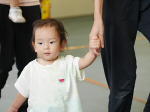お友達や先生と手を繋いで入場です!慣れない環境で不安そうにしていたり、保護者の方を見つけ泣いてしまう子ども達も居ましたが、音楽がかかると気持ちを切り替え頑張って行進し、運動会の歌を大きな声で歌ってくれたり身体で表現してくれていました。