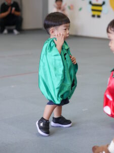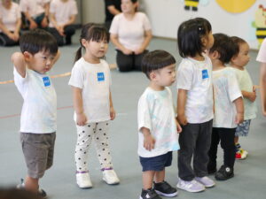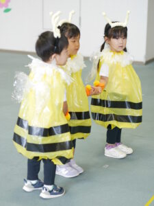 2歳児のみつばちダンスでは、練習当初覚えるのが難しく、苦戦もしていましたが本番ではお友達と協力してしっかりと踊ってくれました。さすが2歳児さん!!