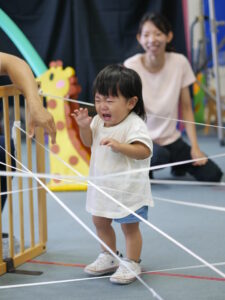 1歳児のサーキットでは、競技直前まで泣いていた子も途中泣き止んで蜘蛛の巣を潜ったり最後までやり切ってくれていました。