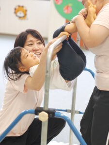 2歳児のサーキットの鉄棒では、当初怖い怖いと言い先生のお腹を蹴って上ることを躊躇していましたが、練習の成果を活かし自信がついた様子!!